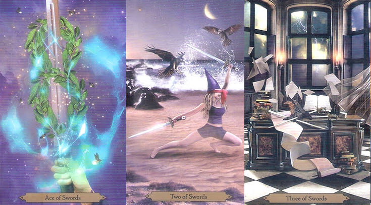 В Двойке мечей говорится о разуме, но море и луна показывают, что интуиция также играет роль в этом решении. Эта карта говорит вам, что для правильного принятия этого решения вы должны использовать все, что есть в вашем распоряжении. Вороны — спутники Одина, Мысли и Память, поэтому вы будете полагаться на прошлый опыт и логику. Поскольку волшебники верят, что сила и знания увеличиваются через посвящение и изучение, Один, норвежский бог, является подходящей связью, так как он многим пожертвовал в в поиске мудрости и знания. Однако, повязка на глазах дает вам понять, что вы не видите всего и, вероятно, не узнаете, пока не потребуются действия.