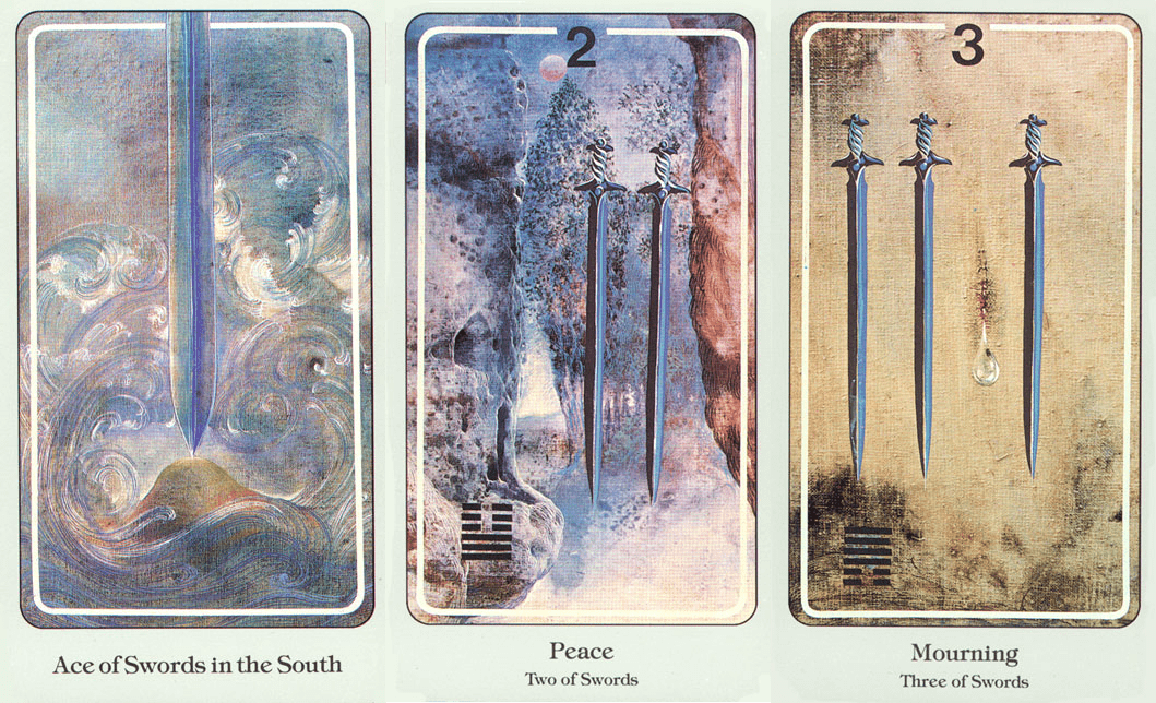 24 Возвращение. Мечи приостановлены, создавая чувство ожидания. Лист падает медленно к основанию, и на нём , жемчужина или пузырь. Белое перо воткнутое в основание, в лесу, показывает перемирие.